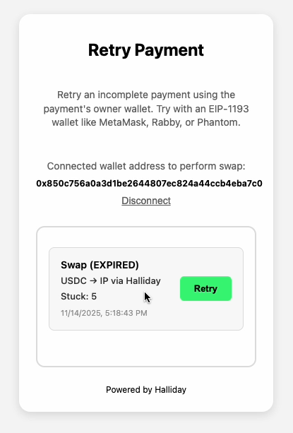 In the event an onramp or swap is funded but fails to complete, a retry can be attempted using assets lingering in a processing address. A retry requires a new quote which uses the lingering assets as the input token amount. Think of retries as a withdrawal of an old payment to deposit into a new payment. The owner address is the sole controller of assets in the processing addresses. The user wallet must sign a transaction to initialize the retry. Payment retries are further explained on the API Recoveries & Errors page.