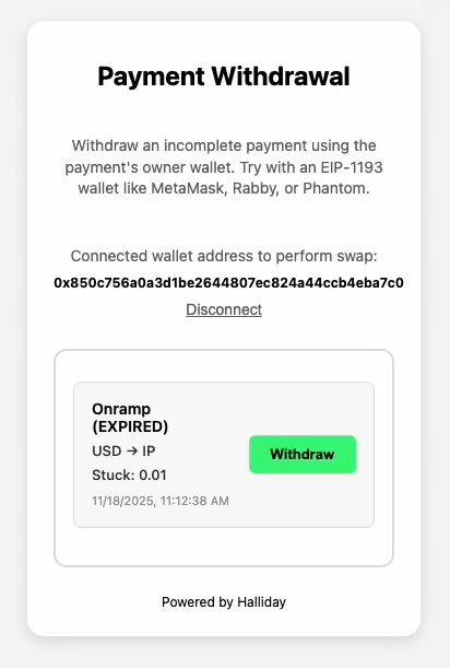In the event that a payment begins its onchain steps and fails to complete them, or assets are sent to a processing address in which the payment is expired, a user can sign a transaction to withdraw the tokens to any address. The owner address, which is usually the user’s wallet, is the sole controller of assets in the processing addresses. An overview and details on the withdrawal process are explained on the API Recoveries & Errors page.