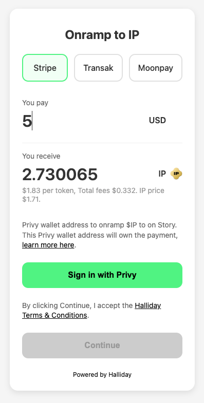 The following open source example app demonstrates building onramps, cross-chain swaps, payment retries, and processing address withdrawals using the Halliday API directly with a Privy connected wallet.