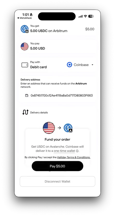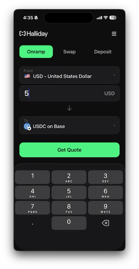 This open source example implements Halliday payments using the API directly. Dependencies include Reown, Expo, and Wagmi. For embedded wallet support, Dynamic can be used to connect a wallet via email address.